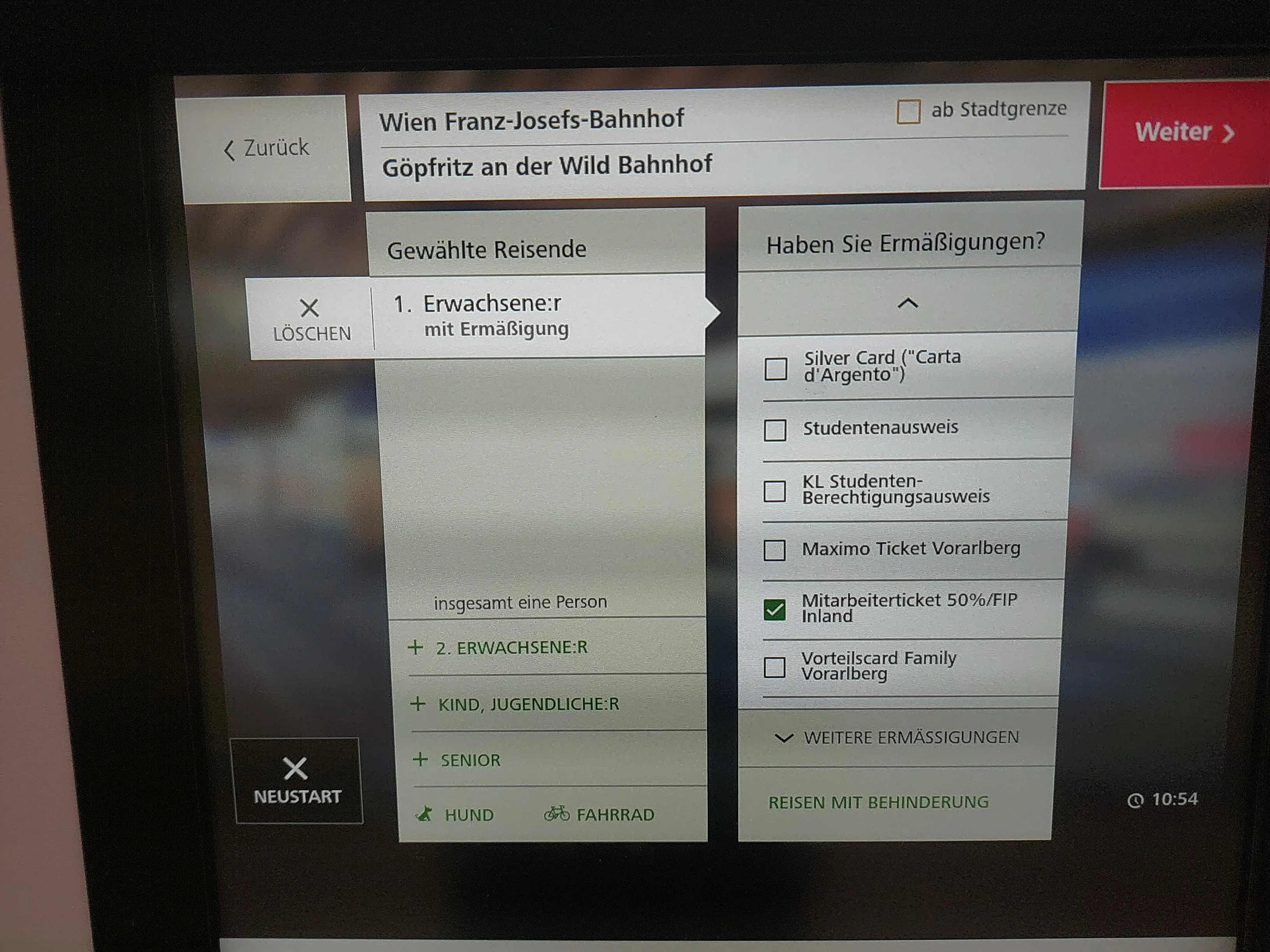 For domestic journeys within Austria, tickets can be purchased at the ticket machine. Select “Domestic ticket with destination selection.” Then choose the „Ermäßigung“ and „Ändern“ buttons. As a discount, you can select „Mitarbeiterticket 50% / FIP-Inland“ or „at. Fbg /FIP Inland“ (at the very bottom).